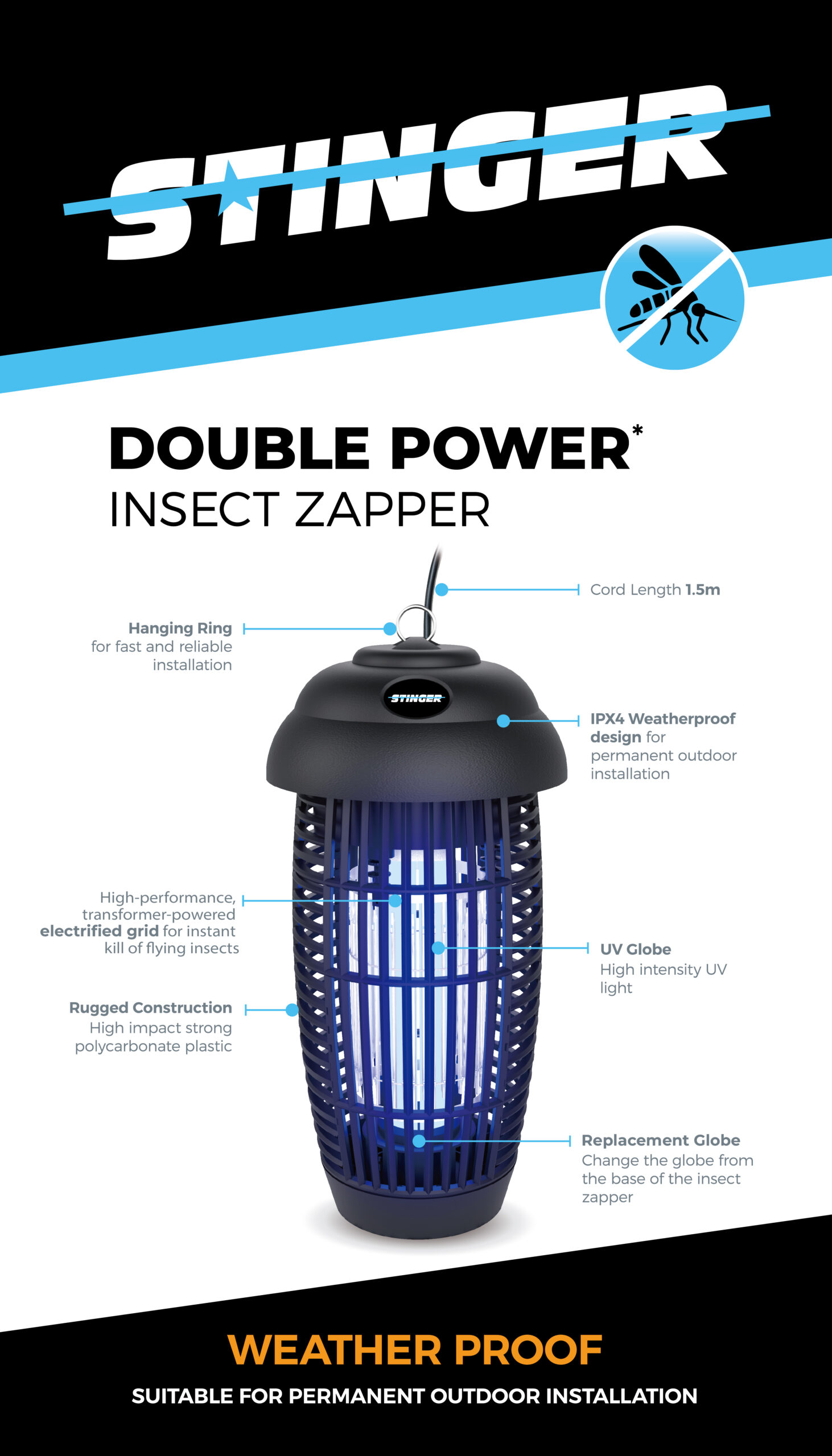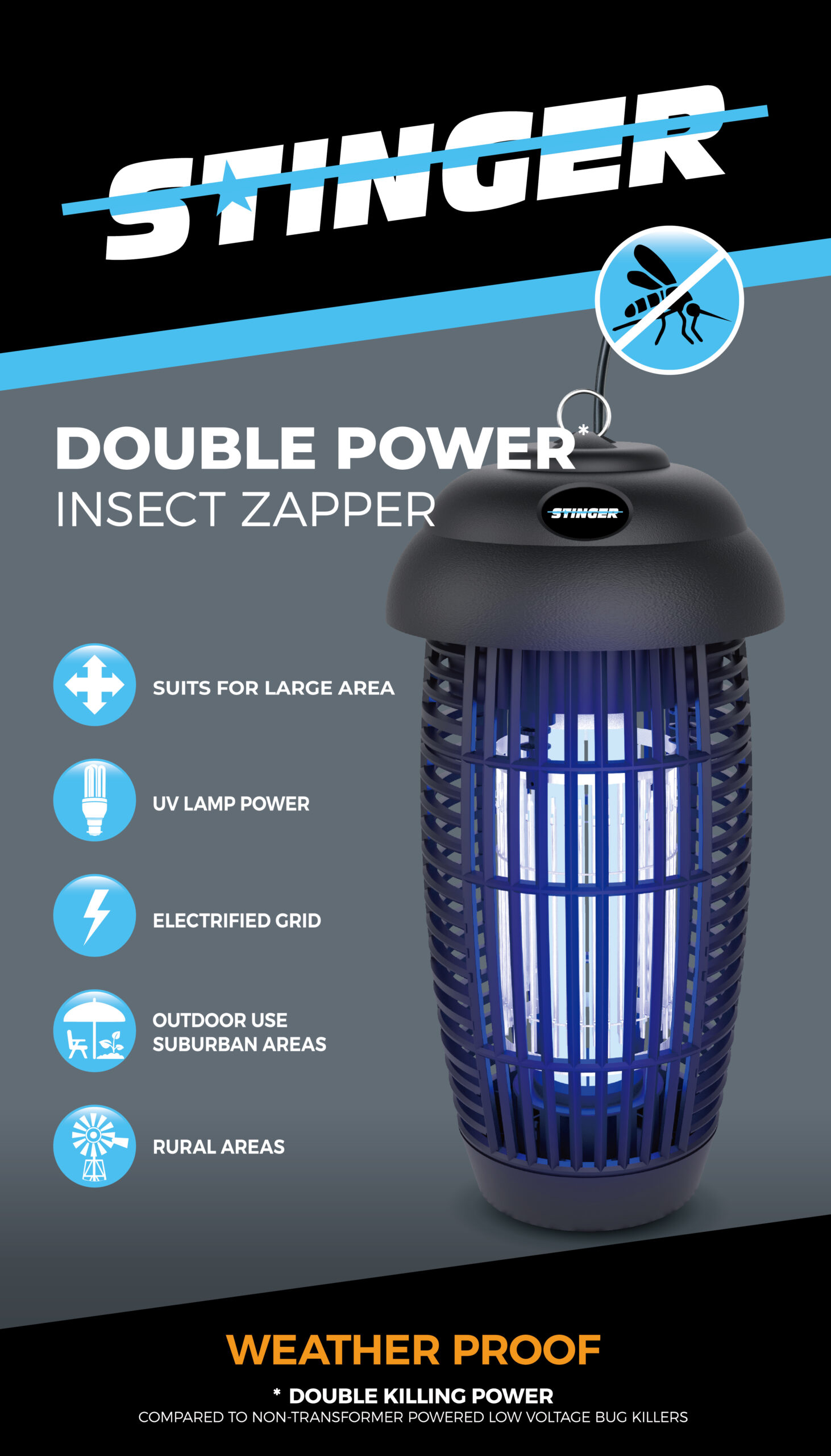 Hang the Stinger off a balcony awning, tree or garden post. Do not position your bug zapper over a heat source or pool, pond or water feature. Always make sure the power plug is under cover. Try to position your Stinger as far away from your outdoor dining space as possible. This will aid in re-directing flying insects away from your dining area, and towards the zapper located in a different area.